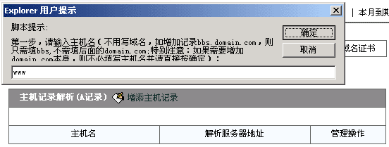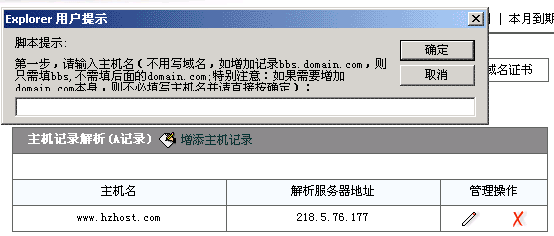 | 通常一個(gè)域名要訪問(wèn)到某個(gè)網(wǎng)站需要兩個(gè)條件,一個(gè)是把該域名解析到放置該網(wǎng)站的主機(jī)IP上;另一個(gè)則是在虛擬主機(jī)上綁定該域名。 現(xiàn)以域名hzhost.com為例,把域名www.hzhost.com以及hzhost.com解析到虛擬主機(jī)上(假設(shè)虛擬主機(jī)的IP地址為218.5.76.177),解析完成后,您將可以用www.hzhost.com以及hzhost.com來(lái)訪問(wèn)您的網(wǎng)站,當(dāng)然(解析完成后,還得在虛擬主機(jī)上綁定才會(huì)生效,本站的虛擬主機(jī)完全具備域名自主綁定功能)。 1>首先請(qǐng)進(jìn)入域名管理。(登錄會(huì)員->英文域名管理->在列表中找到hzhost.com并點(diǎn)擊"域名解析"),對(duì)于新申請(qǐng)的域名,您將看到以下圖例: 2>我們首先來(lái)解析www.hzhost.com到IP:218.5.76.177。 點(diǎn)擊"增添主機(jī)記錄",然后在彈出的框內(nèi)輸入"www",注意,不能輸入"www.hzhost.com"。如下圖所示: ![]() 3>按"確定",然后輸入IP地址:218.5.76.177,如下圖所示: ![]() 4>再按"確定",該解析就完成了,該解析實(shí)時(shí)生效,大大方便了客戶管理,如下圖所示: 5>一般而言,用戶除了用帶www的網(wǎng)址www.hzhost.com來(lái)訪問(wèn)網(wǎng)站外,還喜歡用不帶www的hzhost.com來(lái)訪問(wèn),下面我們來(lái)把hzhost.com解析到IP:218.5.76.177,還是點(diǎn)擊"增添主機(jī)記錄",將出現(xiàn)下圖所示,此時(shí)不必輸入任何字符,直接點(diǎn)擊"確定"。(不輸入字符代表域名hzhost.com本身) ![]() 6>點(diǎn)擊確定后又出現(xiàn)IP地址輸入框,輸入IP:218.5.76.177,然后按確定,如下圖所示: