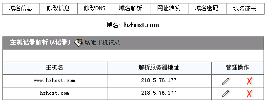 7>按確定后,該解析也完成了。將出現(xiàn)下圖所示。 ![]() 這樣,域名解析部分就結(jié)束了,如果您的虛擬主機(jī)是在本站購(gòu)買的,那么,您只用在虛擬主機(jī)管理里綁定域名www.hzhost.com和hzhost.com,那么,您就可以馬上通過(guò)www.hzhost.com或者h(yuǎn)zhost.com進(jìn)行訪問(wèn)了,如果您的虛擬主機(jī)不是在本站購(gòu)買的,那么,請(qǐng)通知虛擬主機(jī)提供商進(jìn)行綁定。 另外,如果您還使用了郵箱,那么您還要解析郵件交換記錄。具體參見:如何作MX記錄(郵件交換記錄) |