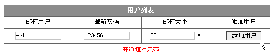 這里以添加web@test.com為例: 1> 進(jìn)入企業(yè)郵局管理界面: 2> 在"郵局用戶管理"頁面,填入"web",注意不能填入"web@test.com" 然后填入郵箱登錄密碼以及分配郵箱大小,點擊"添加用戶"即可: 開通后如下圖所示: