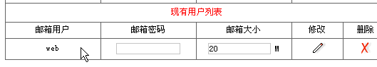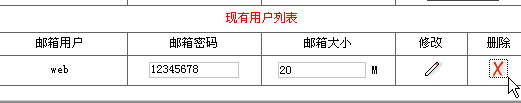 1> 進(jìn)入企業(yè)郵局管理界面: 2> 在"郵局用戶管理"頁面,在需要修改的郵箱對應(yīng)輸入項中輸入新的郵箱密碼或者郵箱大小,點擊修改按鈕即可進(jìn)行修改。 3> 在"郵局用戶管理"頁面,在需要刪除的郵箱后面點擊刪除按鈕即可刪除 。
