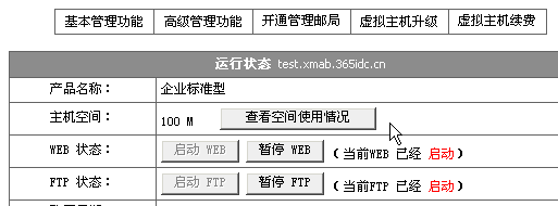 1> 進(jìn)入虛擬主機(jī)管理界面: 2> 在"基本管理功能"頁(yè)面,點(diǎn)擊"查看空間使用情況": 3> 現(xiàn)在您可以看到您的空間使用情況和郵局使用情況