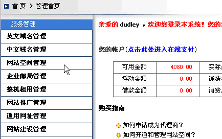 1> 用您的會(huì)員號(hào)登錄本站,如下圖所示: 2> 登錄后進(jìn)入了管理首頁(yè),在左邊點(diǎn)擊"網(wǎng)站空間管理",如下圖所示: 此時(shí)進(jìn)入了虛擬主機(jī)列表里,請(qǐng)選擇您要管理的主機(jī),點(diǎn)擊"主機(jī)名" 此時(shí)您已進(jìn)入了管理界面,可以進(jìn)行各項(xiàng)管理操作了。