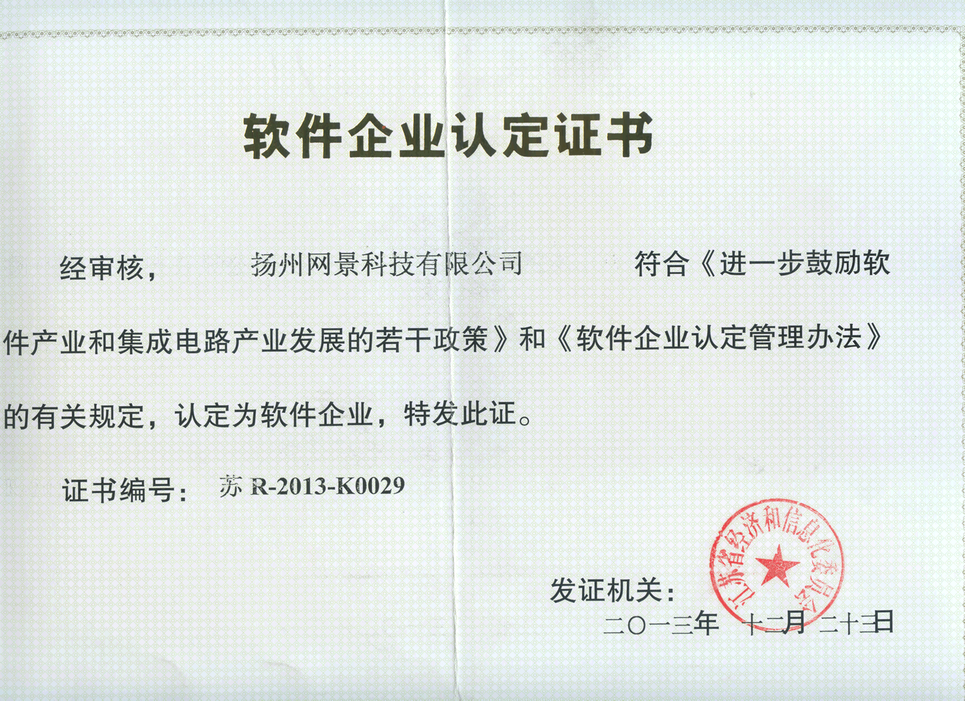 揚(yáng)州網(wǎng)景科技通過軟件企業(yè)認(rèn)證并取得證書