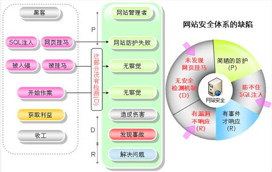 在信息安全建設(shè)從來不能以偏概全。同樣,網(wǎng)站安全也不能從某一個方面考慮,需要從結(jié)構(gòu)性安全的角度來全面思考網(wǎng)站安全。我們不妨用PDR模型作為一個視角,從防護(hù)(P)、檢測(D)、響應(yīng)(R)的角度來看待網(wǎng)站安全問題現(xiàn)狀,一個安全結(jié)構(gòu)的設(shè)計,如果Pt(防護(hù)時間)>Dt(檢測時間)+Rt(響應(yīng)時間),那么我們認(rèn)為這個結(jié)構(gòu)就是安全的,很多安全設(shè)施的設(shè)計都參考這個理論模型。