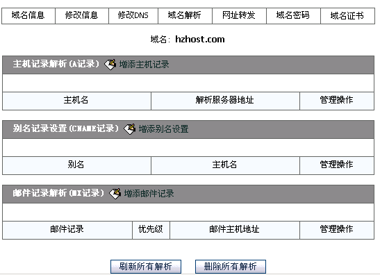| 通常一個(gè)域名要訪問(wèn)到某個(gè)網(wǎng)站需要兩個(gè)條件,一個(gè)是把該域名解析到放置該網(wǎng)站的主機(jī)IP上;另一個(gè)則是在虛擬主機(jī)上綁定該域名。 現(xiàn)以域名hzhost.com為例,把域名www.hzhost.com以及hzhost.com解析到虛擬主機(jī)上(假設(shè)虛擬主機(jī)的IP地址為218.5.76.177),解析完成后,您將可以用www.hzhost.com以及hzhost.com來(lái)訪問(wèn)您的網(wǎng)站,當(dāng)然(解析完成后,還得在虛擬主機(jī)上綁定才會(huì)生效,本站的虛擬主機(jī)完全具備域名自主綁定功能)。 1>首先請(qǐng)進(jìn)入域名管理。(登錄會(huì)員->英文域名管理->在列表中找到hzhost.com并點(diǎn)擊"域名解析"),對(duì)于新申請(qǐng)的域名,您將看到以下圖例: 2>我們首先來(lái)解析www.hzhost.com到IP:218.5.76.177。 點(diǎn)擊"增添主機(jī)記錄",然后在彈出的框內(nèi)輸入"www",注意,不能輸入"www.hzhost.com"。如下圖所示: ![]() 3>按"確定",然后輸入IP地址:218.5.76.177,如下圖所示: ![]() 4>再按"確定",該解析就完成了,該解析實(shí)時(shí)生效,大大方便了客戶管理,如下圖所示: 5>一般而言,用戶除了用帶www的網(wǎng)址www.hzhost.com來(lái)訪問(wèn)網(wǎng)站外,還喜歡用不帶www的hzhost.com來(lái)訪問(wèn),下面我們來(lái)把hzhost.com解析到IP:218.5.76.177,還是點(diǎn)擊"增添主機(jī)記錄",將出現(xiàn)下圖所示,此時(shí)不必輸入任何字符,直接點(diǎn)擊"確定"。(不輸入字符代表域名hzhost.com本身) ![]() 6>點(diǎn)擊確定后又出現(xiàn)IP地址輸入框,輸入IP:218.5.76.177,然后按確定,如下圖所示: