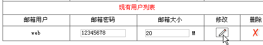 1> 進(jìn)入企業(yè)郵局管理界面: 2> 在"郵局用戶管理"頁面,在需要修改的郵箱對應(yīng)輸入項中輸入新的郵箱密碼或者郵箱大小,點擊修改按鈕即可進(jìn)行修改。 3> 在"郵局用戶管理"頁面,在需要刪除的郵箱后面點擊刪除按鈕即可刪除 。