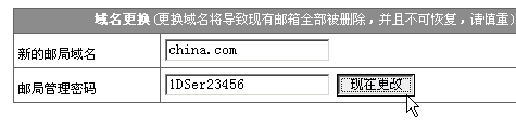 這是本公司自主開發(fā)的虛擬主機管理系統(tǒng)的重要優(yōu)勢之一,您完全可以自主更換郵局域名。 1> 進(jìn)入企業(yè)郵局管理界面: 2> 在"郵局域名更換"頁面,輸入新的域名和管理密碼。 3> 單擊"確定"即可。 注意:更換域名后,舊的郵箱都將不復(fù)存在而且不可恢復(fù),請慎重。