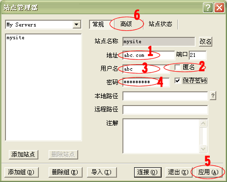 3.點(diǎn)擊“確定”后,出現(xiàn)以下界面。在1處輸入您的站點(diǎn)地址(如:abc.com),將2處“匿名”前的選鉤去掉,在3處輸入FTP用戶(hù)名(如:abc),在4處輸入FTP密碼(將保存密碼前的選鉤打上),點(diǎn)擊5處“應(yīng)用”按鈕;