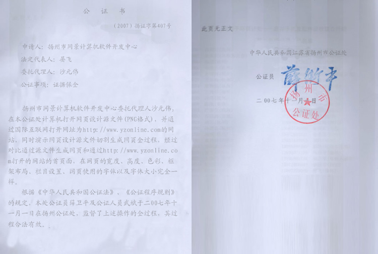揚州網(wǎng)景最新網(wǎng)站已于2007年11月2日改版上線,鑒于以往我們的網(wǎng)站美工設(shè)計屢次遭到本地同行的抄襲,揚州網(wǎng)景于昨天(2007年11月1日)對本次的網(wǎng)站改版美工設(shè)計的源文件在揚州公證處進行了公證(查看公證書),以后發(fā)現(xiàn)任何對我們網(wǎng)站的抄襲和惡意模仿行為絕不手軟,必將訴諸法律,依法追究其責(zé)任。同時敬告那些抄襲者自重,尊重知識產(chǎn)權(quán)和別人的勞動成果。 |