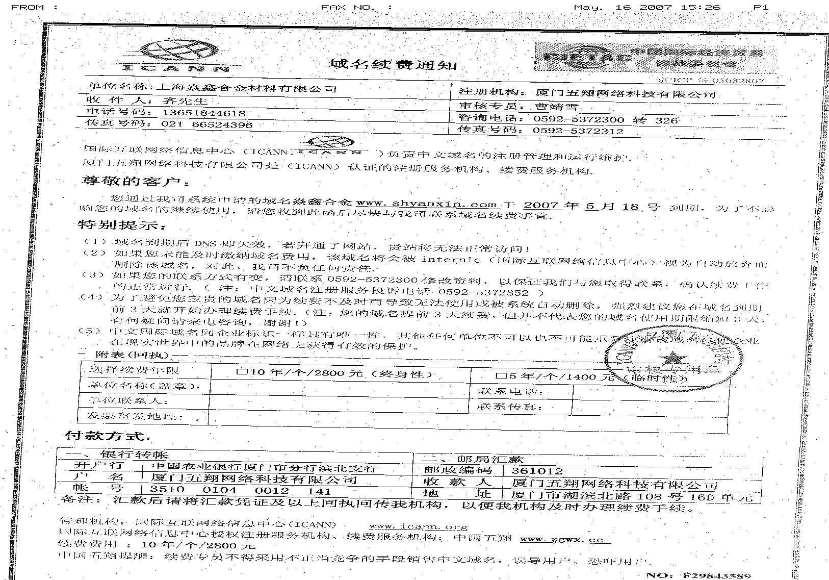 近來,我司收到客戶投訴以及同行業(yè)其他公司反饋, 發(fā)現(xiàn)最近福建省(尤其是廈門地區(qū)),有部分不法分子、不法網(wǎng)絡(luò)公司利用傳真、電話或是電子郵件的方式對(duì)我司客戶實(shí)施欺詐(其中傳真方式最多見),給我司客戶發(fā)出業(yè)務(wù)域名到期等不真實(shí)的、虛擬的續(xù)費(fèi)通知函(或通知郵件、電話、傳真等),甚至說一次性匯款3000元,域名可以終生使用,一些客戶可能會(huì)因此上當(dāng)受騙,把錢匯到這些所謂公司提供的私人賬戶上,但續(xù)費(fèi)業(yè)務(wù)(或新增業(yè)務(wù))并沒有得到任何保障。